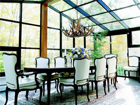 陽(yáng)光房裝修設(shè)計(jì)方案4、如果是需要傳統(tǒng)建筑功能(如:特色客廳、書房、活動(dòng)室等)的陽(yáng)光房,宜選擇鋼化中空玻璃屋頂,并配有適量專用中空玻璃天窗,以斷橋鋁中空玻璃窗或鋁木復(fù)合中空玻璃窗作周邊維護(hù)的產(chǎn)品。在使用時(shí)還需配備專用遮陽(yáng)簾、遮陽(yáng)棚、隱形紗窗等產(chǎn)品。如果追求最新時(shí)尚且預(yù)算充裕的話,可挑選最新高科技的調(diào)光玻璃作為陽(yáng)光房的玻璃,可遙控調(diào)節(jié)玻璃的透明與不透明,綠色節(jié)能的同時(shí),完全保護(hù)隱私。