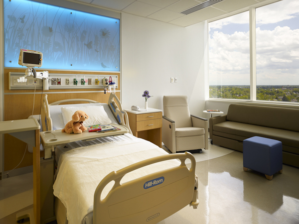 一般醫(yī)院多為一間病房有2~3間病床并配有衛(wèi)生間,病房門(mén)入口凈寬應(yīng)為1050mm,以保證單架車(chē)出入,門(mén)套應(yīng)能抗沖擊。壁柜按每床600mm即可。座便器選用后背懸掛式對(duì)清潔有利。床頭柜可用懸掛式。天花不易有多種造型,多用礦棉板或紙面石膏板。輸液架預(yù)埋龍骨。燈光應(yīng)多路控制。開(kāi)窗為內(nèi)倒開(kāi)為宜,以滿(mǎn)足通風(fēng)、安全防護(hù)、方便清潔三種需要。入門(mén)口玻璃要選擇透明無(wú)色。