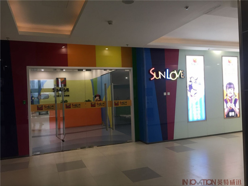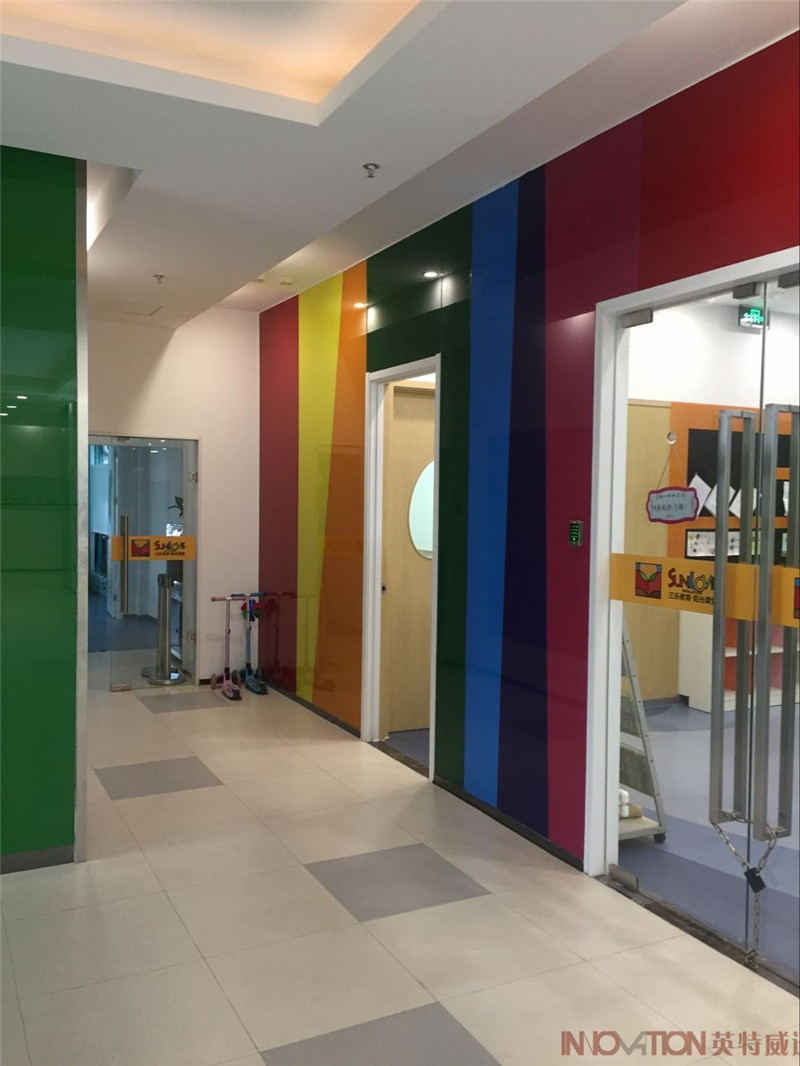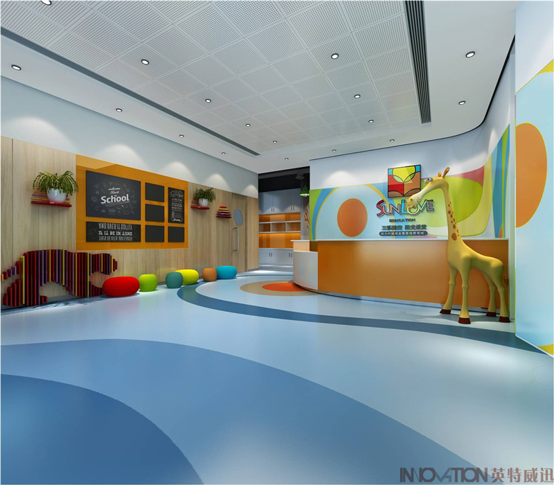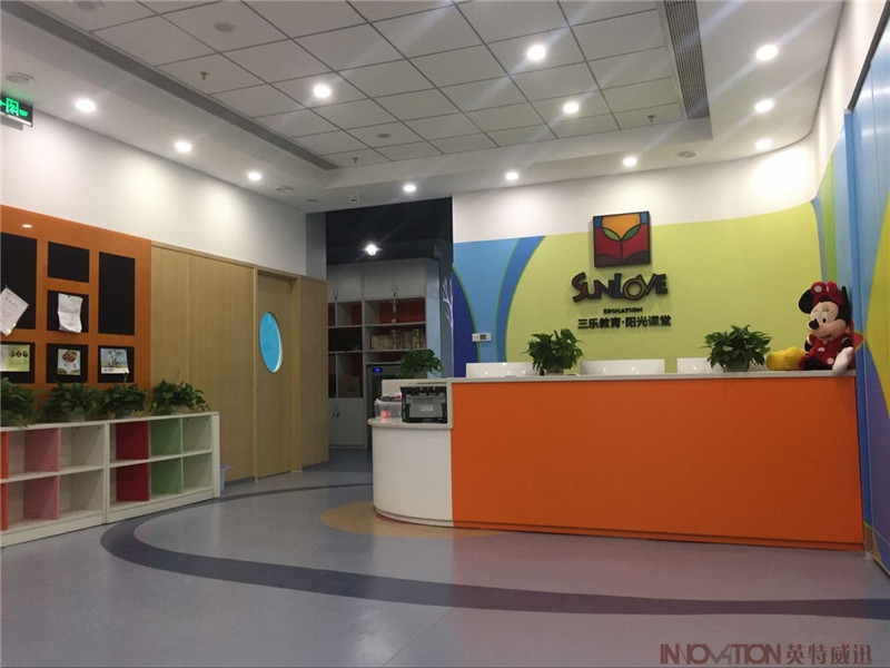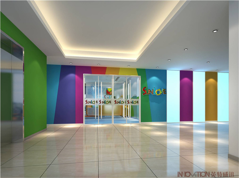 進入大廳,首先映入眼簾的是入口門廳和logo墻,設計中大膽使用色彩鮮明的跳躍性線條,更好的體現(xiàn)個性化教學的特色。