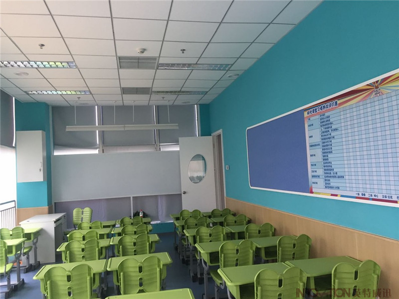 教室設計以藍色背景墻面為基礎,和室內(nèi)課桌的藍色相呼應,給人一種藍色海洋的清爽感覺。墻面圖案樣式多樣,顏色豐富,突出圖案的多樣性和多變性。