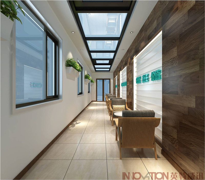 本案采用木質(zhì)的材質(zhì)與植物墻為載體體現(xiàn)公司的清潔能源的性質(zhì),木質(zhì)的天然紋理與生機(jī)勃勃的植物。入口側(cè)墻的多媒體電視滾動(dòng)播放公司的電子資料,讓訪客能盡快了解公司的狀況及未來(lái)的發(fā)展方向。白色烤漆造型與灰綠色背漆玻璃營(yíng)造的時(shí)尚簡(jiǎn)潔的公司展廳進(jìn)一步解析公司取得的成就。