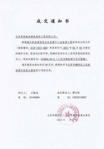 根據(jù)建外街道建國里社區(qū)黨建中心站裝修工程競(jìng)爭(zhēng)性談判文件(招標(biāo)編號(hào):BJJF—2017—668)和英特威迅于2017年5月22日提交的報(bào)價(jià)文件,經(jīng)談判小組評(píng)審,現(xiàn)確定英特威迅為上述項(xiàng)目招標(biāo)的預(yù)成交人,預(yù)成交報(bào)價(jià)為445000.00元(人民幣肆十肆萬伍千圓整)。