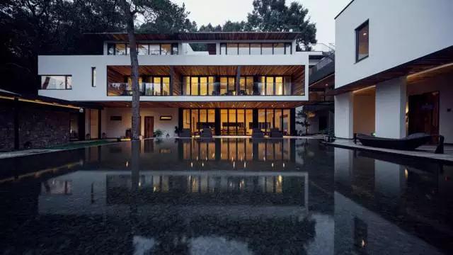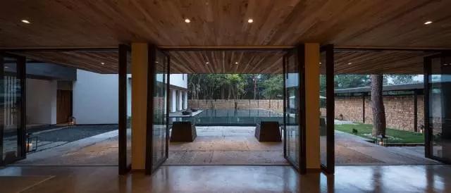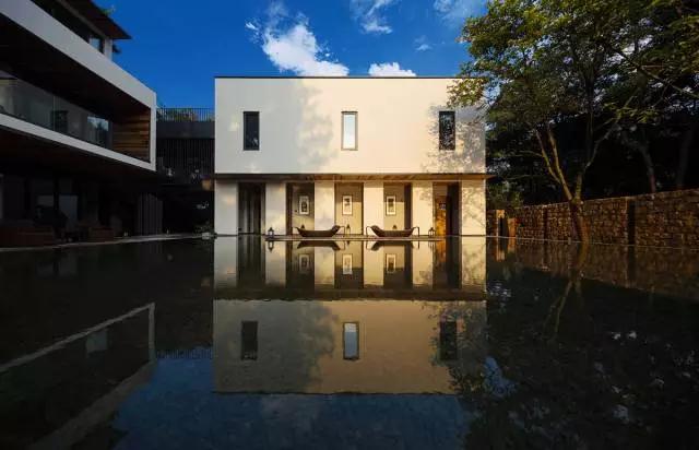 為了強化“禪院”的體驗,“山”的意象也在體驗中被一再提示,不僅進入酒店前需要真實的爬山,一條“游山”的路徑也被設(shè)計進了酒店內(nèi)部:入口及院落被分解在多個標高,爬升行為被有意識地與場所光線的曖昧差別聯(lián)系起來。光線被挑檐、水面、柱廊、格柵、天窗等要素仔細控制后,由下至上形成由暗『晦澀』及明『現(xiàn)代』的氛圍轉(zhuǎn)換,最終在只能看見天與樹冠的屋頂露臺達到明的極致,建筑『人工』從視線中消失。