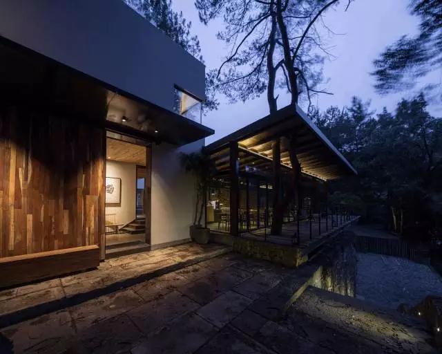 通過對周邊景觀資源的研判,西側(cè)建筑的高度被降低為一層,西側(cè)層層遠山的輪廓成為了院中及客房陽臺的重要景觀,金色的夕陽也可以以接近水平的角度照進院中,朝西主立面在夕陽和水面的多維度強化下顯現(xiàn)出強烈儀式感,塑造出“禪院”的意象。南側(cè)以160公分高的院墻把山林與院子隔開。沿著山風吹來的路徑,U形建筑北側(cè)兩個角部被打開:西北角的主入口設(shè)置了對角交錯的兩個門洞,從門外便可恰好看到院內(nèi)保留的松樹;而東北角增加了交通院,通透的直跑鋼樓梯以黑色金屬格柵與綠林相隔,引入山風的同時一并接納了清晨的陽光。這兩處斜向的對角院落『門廳』設(shè)置,也拉長了視線的距離,使原本140平米左右的院落被無限延伸。