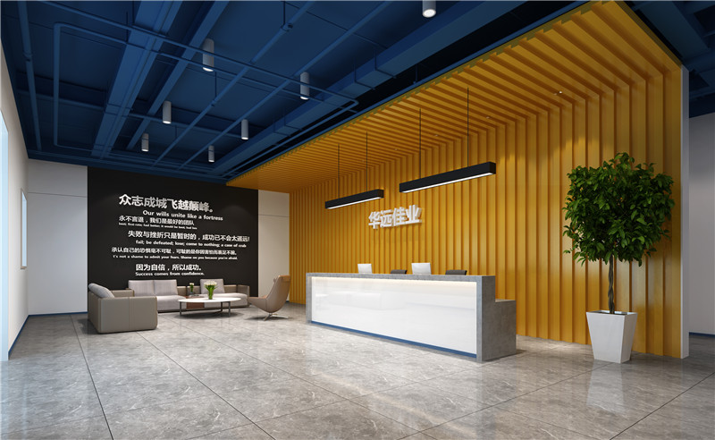 一進(jìn)公司首先映入眼簾的是黃色的背景墻,公司品牌形象“華遠(yuǎn)佳業(yè)”四個(gè)大字和公司形象墻上的企業(yè)文化標(biāo)語(yǔ),讓客戶更直觀的認(rèn)識(shí)和了解公司的品牌和企業(yè)文化。北京辦公室設(shè)計(jì)藍(lán)色的吊頂和黃色的背景墻更是相互呼應(yīng),前臺(tái)上方泛著白光的兩盞長(zhǎng)條節(jié)能吊燈和小筒燈更是把前廳的光線提高了許多。