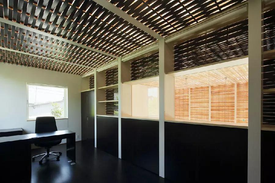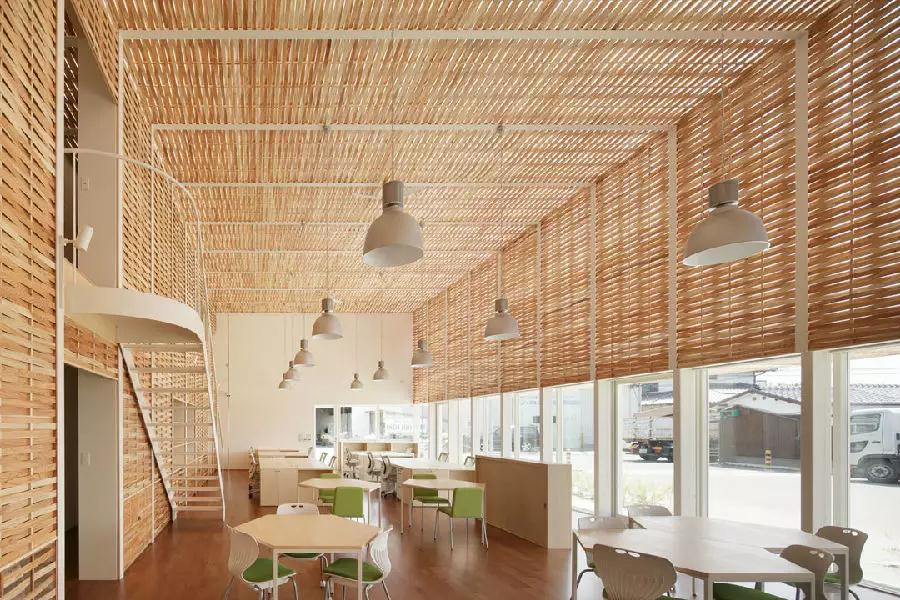 辦公室建筑的墻壁和天花都是玻璃的,內部覆蓋上一層編織如柳框圖樣的木條層,這層材料讓白天的天光變得柔和,人們不需要開燈就能辦公;這層材料也使辦公室不至于過熱,減少對空調的依賴。