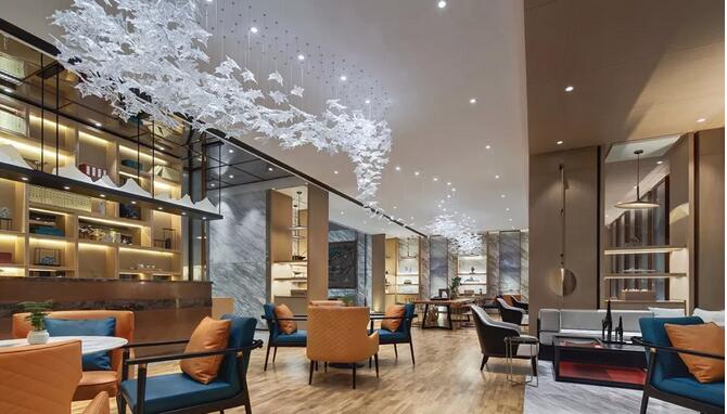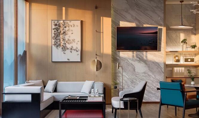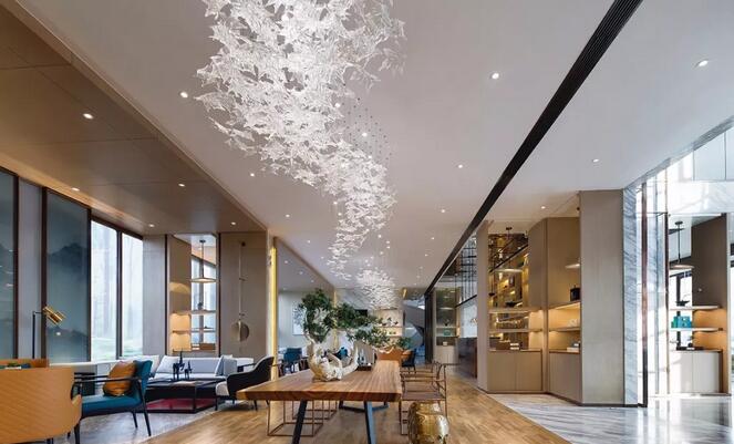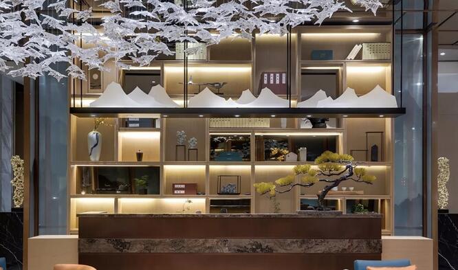 “夫畫道之中,水墨最為上。肇自然之性,成造化之功?!钡袼堋澳琛币詾V盡色彩剔透琉璃為墨,飽蘸筆觸,起承轉合,縱橫貫穿于洽談區(qū),成了空間最純粹的風景。