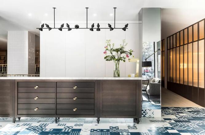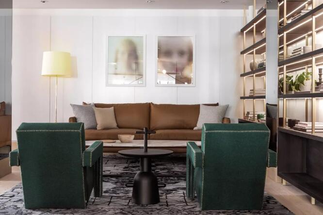 建筑師對(duì)首層空間進(jìn)行了重新配置,新的入口與街道形成視覺(jué)上的聯(lián)系,通過(guò)一系列大廳和休息室改善了顧客的空間體驗(yàn)。原先位于酒店中心的休息室被改造為新的花園房,將自然光和新鮮空氣引入建筑中央,同時(shí)作為連接House酒吧的入口平臺(tái)。植物元素貫穿了整個(gè)酒店,新的入口被設(shè)計(jì)為一個(gè)后退于喧鬧街道的景觀(guān)化的場(chǎng)所。室內(nèi)家具同樣參照了自然元素,遵循了金普頓酒店的一貫作風(fēng):鹿和蜜蜂裝飾著客房的門(mén)環(huán);小鳥(niǎo)造型的吊燈;裝有Kit Miles絲絨軟墊的Gubi椅子還點(diǎn)綴著漂亮的蜻蜓圖案。
