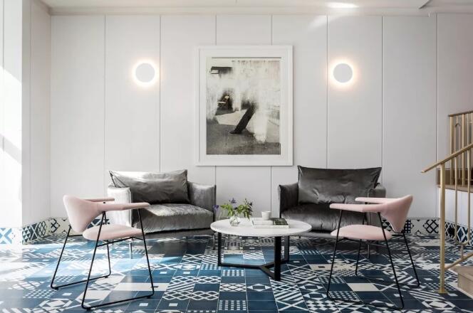 客人們首先經(jīng)由弧形頂棚下方的白色水磨石樓梯到達(dá)酒店入口。設(shè)計(jì)大膽的定制綠色水磨石墻壁定義出入口區(qū)域,種滿(mǎn)植物的立面為之增添了柔和的質(zhì)感。植物中間還鑲嵌著一串粉色的霓虹燈字:“呼吸”。建筑師為酒店接待處設(shè)計(jì)了一款帶有圖案的藍(lán)白色琉璃地磚,其設(shè)計(jì)靈感來(lái)源于荷蘭傳統(tǒng)的代夫特陶器。接待臺(tái)后方,鋪設(shè)著白色瓷磚的壁爐邊環(huán)繞著一排軟墊沙發(fā),搭配抱枕和地毯,帶來(lái)閱讀和放松的空間。一系列精心挑選出來(lái)的當(dāng)代藝術(shù)品和特色燈具,共同為四周的墻壁帶來(lái)活力。