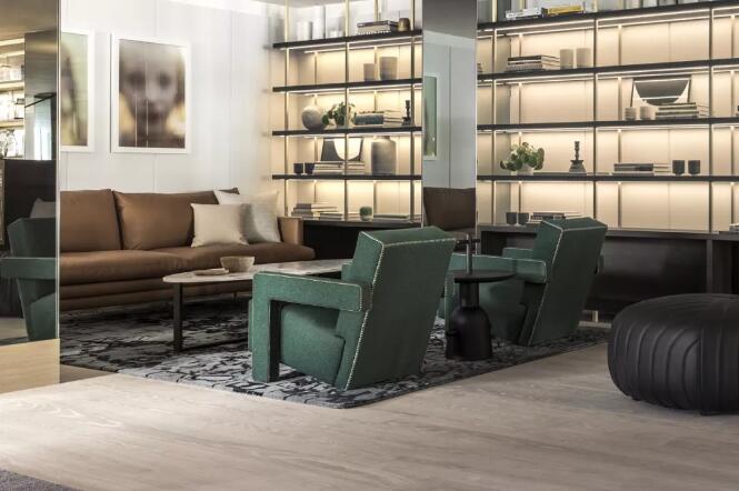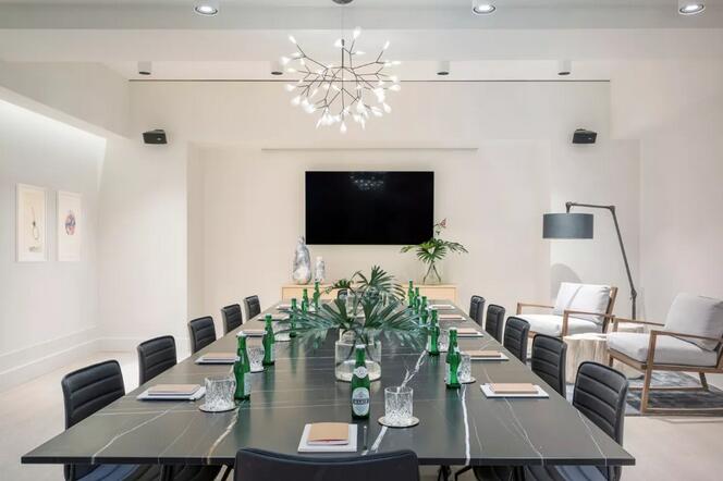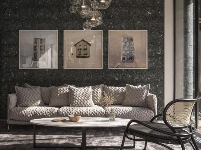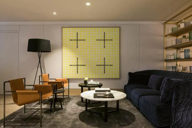 客廳隱藏在酒店的中心,位于House酒吧旁邊。這一清新而優(yōu)雅的空間包含一個(gè)外部庭院,由通高的鋼架玻璃墻圍合起來(lái),其中布置著各式各樣的植物、垂花吊燈和秋千椅??蛷d內(nèi)部的地面呈對(duì)角鋪設(shè)著淺色的橡木板,當(dāng)中穿插著一些光滑的方形混凝土磚。室外的庭院同樣延續(xù)了這一圖案,由混凝土和黑色的砂礫鋪成。在夏天,庭院可將光線(xiàn)和新鮮空氣引入室內(nèi),成為在陽(yáng)光中小酌一杯的完美聚會(huì)空間。