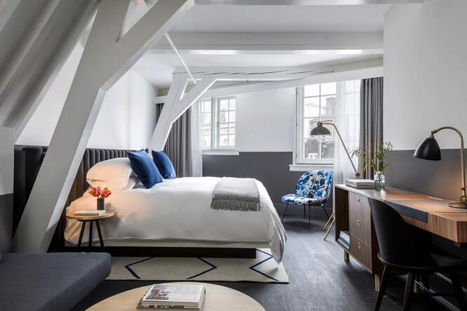 阿姆斯特丹的Kimpton De Witt是金普頓酒店集團(tuán)旗下第一家位于美洲以外地區(qū)的酒店,它坐落在阿姆斯特丹繁華的市中心,步行即可抵達(dá)中央車(chē)站。酒店共包含274間客房,其中15間是特級(jí)客房。來(lái)自倫敦的Michaelis Boyd事務(wù)所與金普頓酒店集團(tuán)副總裁兼設(shè)計(jì)與創(chuàng)意總監(jiān)Ave Bradley共同為酒店打造了全新的、以建筑為導(dǎo)向的室內(nèi)空間。充滿(mǎn)現(xiàn)代感的木質(zhì)墻壁、淺色橡木地板、鋼架玻璃墻以及定制的水磨石墻共同為酒店賦予特色。酒店的設(shè)計(jì)靈感源于金普頓一向充滿(mǎn)趣味的設(shè)計(jì)手法,同時(shí)融合了現(xiàn)代建筑理念以及傳統(tǒng)的阿姆斯特丹風(fēng)格。