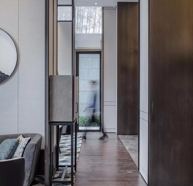 此次改造的重點,一是入口,二是內(nèi)部平面功能的重新設(shè)定。樸悅希望整個銷售中心的改造能與外界形成一種反差,以不同的場景營造形成有趣的體驗。整個售樓處鬧中取靜,幽靜的內(nèi)院獨享一片城市的寧靜。基于這個優(yōu)勢,設(shè)計師將原正面入口移至左側(cè),并在內(nèi)庭改建了一處廊道,以序列感排列的木格柵構(gòu)建,溫暖靜謐、平靜中帶來舒緩的節(jié)奏,以此形成步入的初始印象。