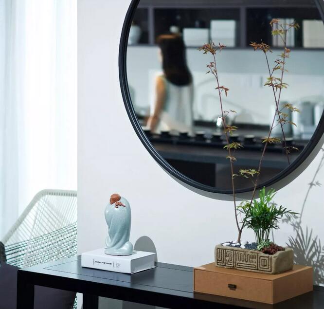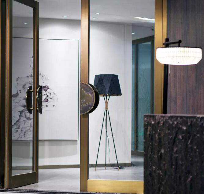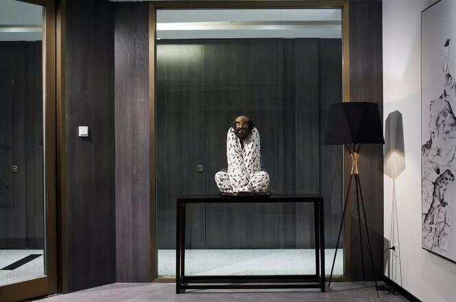 透過入口玻璃窺探,一幅太湖石畫映入眼簾,千古名石肌理由蒙古黑燒制而成,引園林意境入室。達摩的雕塑隱喻了當下語境中禪意美學(xué)的回歸。