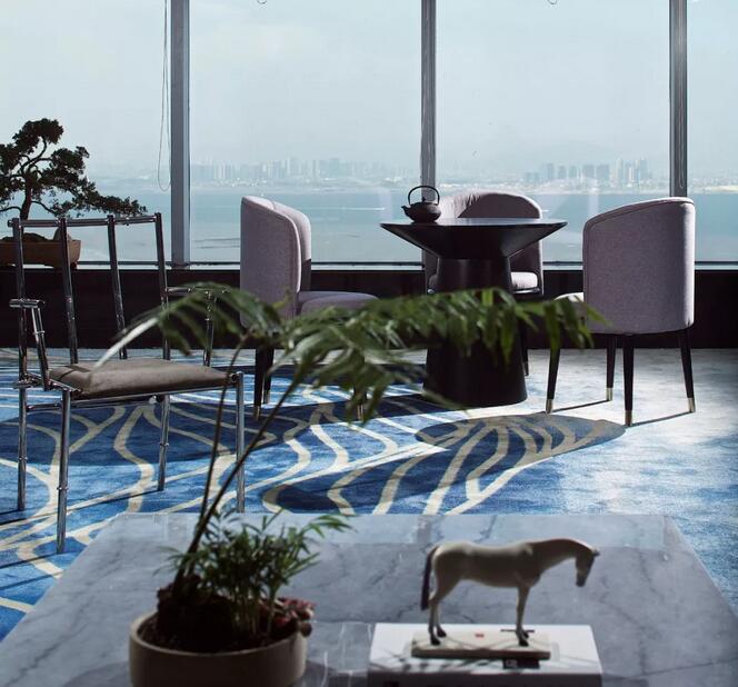 男賓VIP區(qū)可享受廈門當?shù)氐钠凡柚?。定制地毯呈寫意黑灰色線條,與屋頂燈飾遙相呼應(yīng),形成體系。