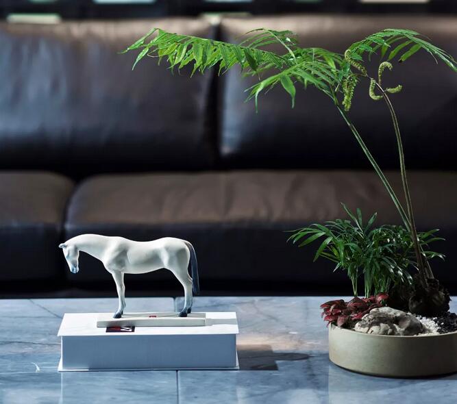 休閑區(qū)內(nèi),一株松柏透出骨子里濃濃的文人趣味,屏風之后又是海納百川的廣闊胸懷??臻g中的新中式書架以及皮質(zhì)沙發(fā)通常服務(wù)于成功男性,設(shè)計師將傳統(tǒng)交椅的小尺度改為大比例,為舒適加分,觀賞海景的同時帶來君臨天下的會談體驗。