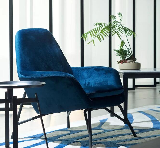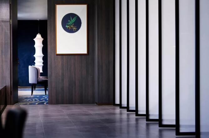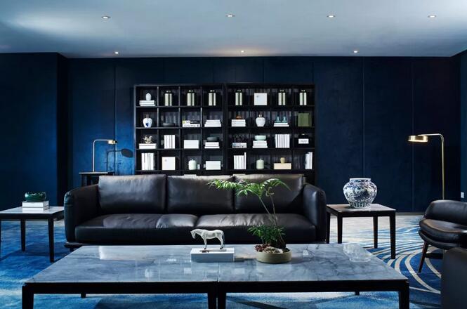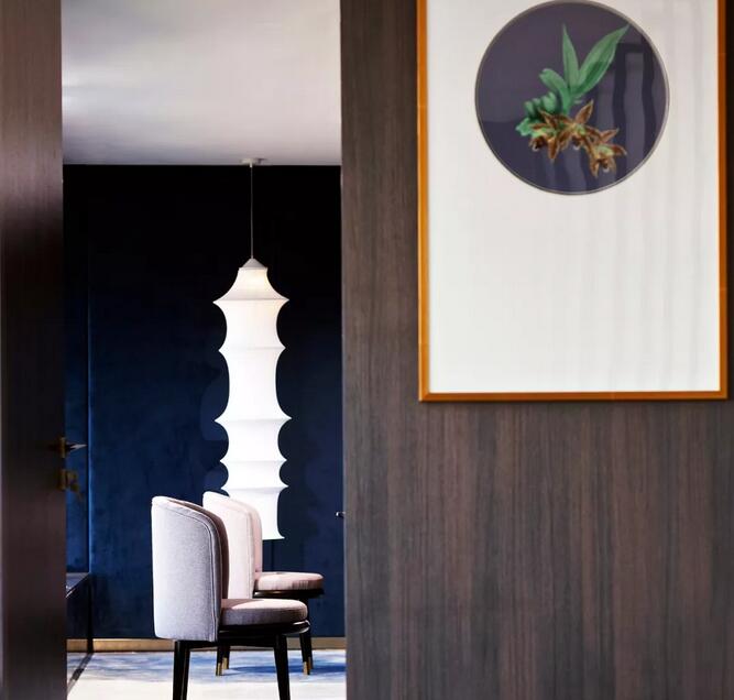 中式元素跟摩登的這種碰撞很奇妙,你可能會覺得這兩個風格不想(相)干,但是在兩位設(shè)計師看來卻是十分和諧。簡潔大氣的設(shè)計框架中點綴中國古典山水之意蘊。休閑區(qū)沙發(fā)上的藍色絲絨,仿佛也是空間故事的起承轉(zhuǎn)合。