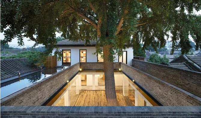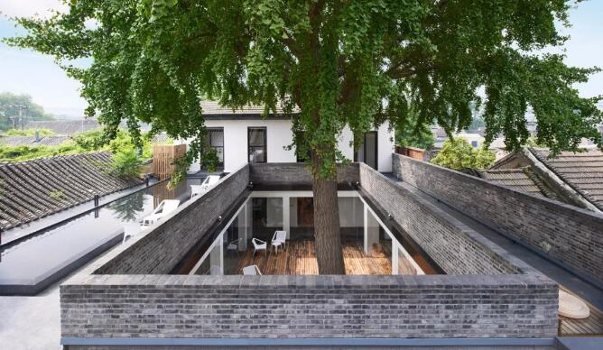 院子是“四合院”建筑的居住樂(lè)趣所在。順著廊道來(lái)到后院,東側(cè)角落坐落著一處被青磚包圍的景觀空間。穿過(guò)后院,通過(guò)南側(cè)樓梯上到二層。二層的露臺(tái)由一層廊道屋頂連通而成,形成坐于屋瓦之間、樹(shù)蔭之下的典型北京胡同文化體驗(yàn):夏聽(tīng)蟬鳴,冬看白雪黛瓦。