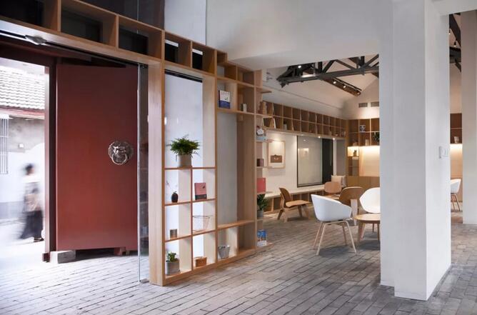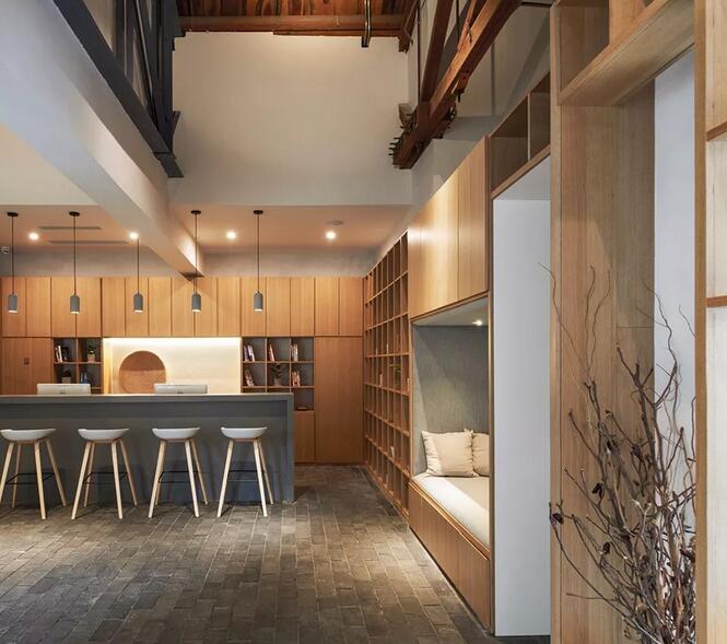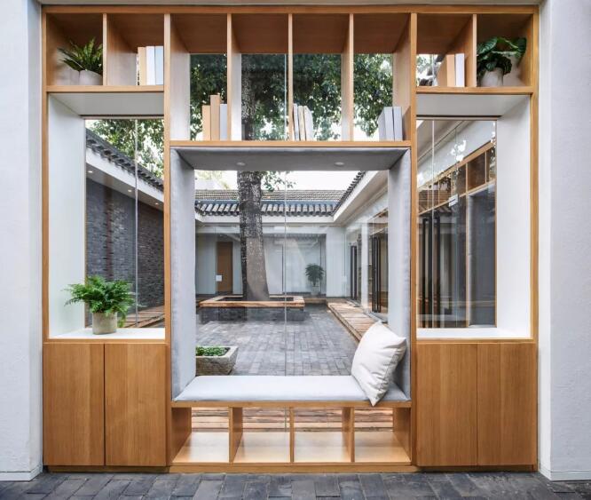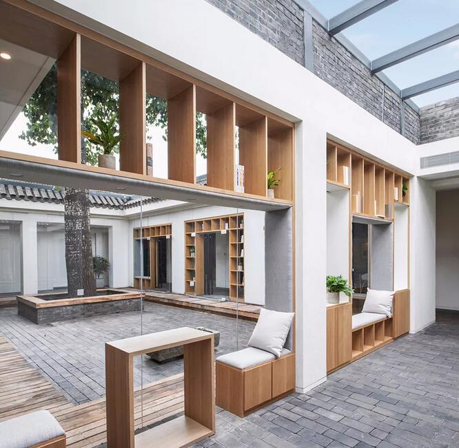 前院東側(cè)通道為可供休憩的共享廊道空間,這條公共走廊使城市和胡同的街道得以延長(zhǎng),形成“半戶外街道”式的全新空間,灰磚與公共家具既成為連接著過(guò)去的橋梁,也將膠囊空間變成一個(gè)真正的“家”。整條廊道貫穿前、后院,利用落地窗,隔而不斷,框取庭院風(fēng)光。游走長(zhǎng)廊時(shí)仿若置身悠長(zhǎng)的胡同,原本陌生的游客、住客、鄰里不自覺(jué)停駐于此邂逅交流。更能以具有流動(dòng)性的書本為媒介,通過(guò)公共家具的引導(dǎo)帶來(lái)別具趣味的“交流”。