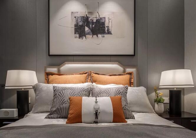 空間以優(yōu)雅與低調(diào)的材質(zhì)為主,軟裝材料以有質(zhì)感的棉麻搭配帶有山水元素的絲光布,家具主要以深木飾面為主。