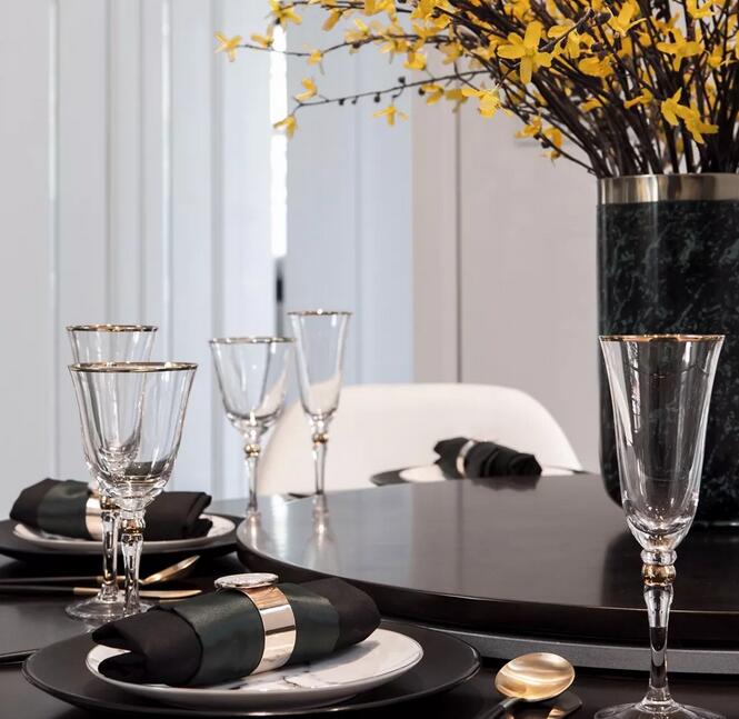 墻面亮白色的護(hù)墻板加上亮金色鋼條組合,簡(jiǎn)化了歐式繁復(fù)的做法,能夠體現(xiàn)出當(dāng)代生活下的歐式高貴情結(jié)。