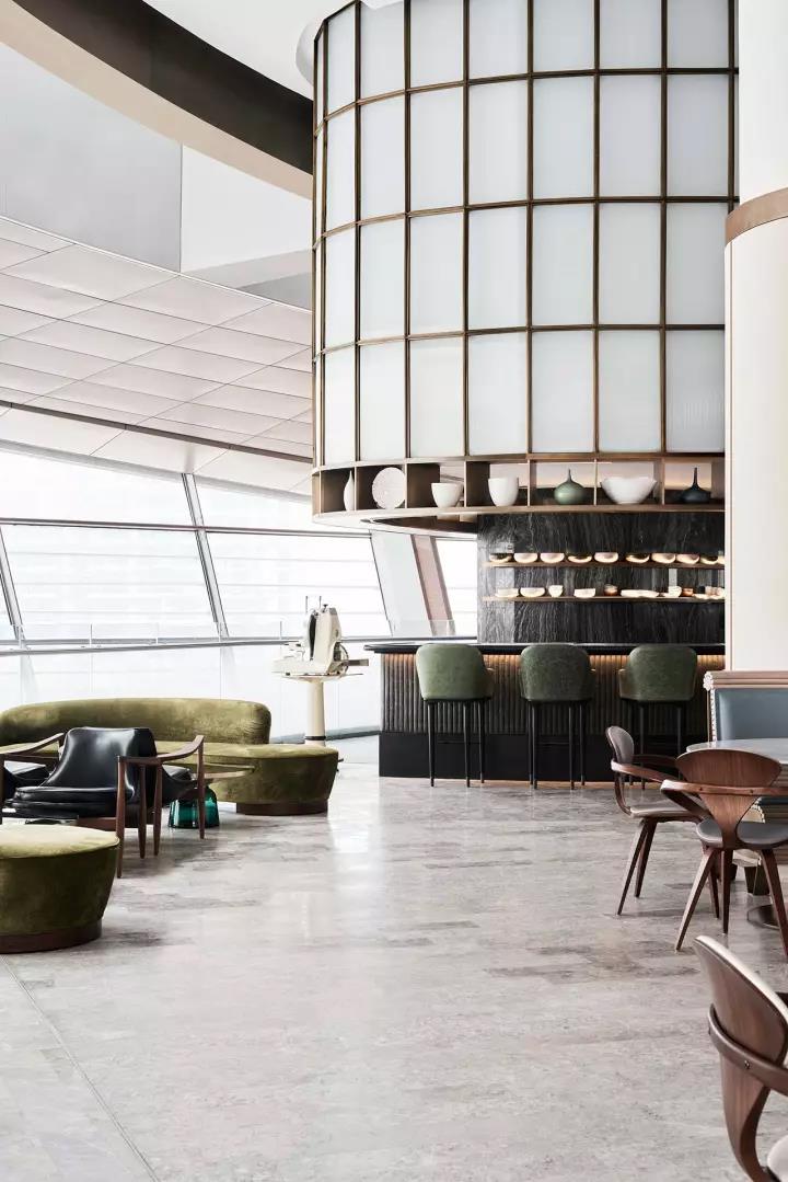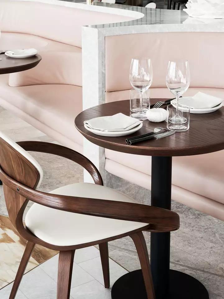 布藝部分使用綠色、灰色、藍(lán)色和白色的皮革面料傳遞強(qiáng)烈的海洋氣息,搭配中世紀(jì)天然的胡桃木家具,Serge Mouille的蜘蛛臂落地?zé)?。使整個(gè)餐廳猶如一顆珍珠般璀璨耀眼。