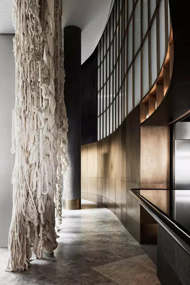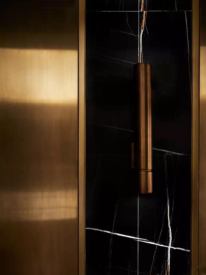 餐廳的設(shè)計(jì)從迪拜歌劇院和主廚對(duì)生蠔的熱愛(ài)中獲取靈感。在主餐廳里,一種粉色和奶油色的皮革和淺灰色的大理石色調(diào),類似生蠔內(nèi)部,而外圍則有一系列深色的灰色、綠色和黑色的色調(diào),讓人想起生蠔殼風(fēng)化紋理。貼著瓷磚的拱形天花板類似海上的波浪,加強(qiáng)了海洋主題的設(shè)計(jì)理念,手工制作的藍(lán)色羊毛地毯,是Alexander & Co特別設(shè)計(jì)來(lái)模擬海洋水域。