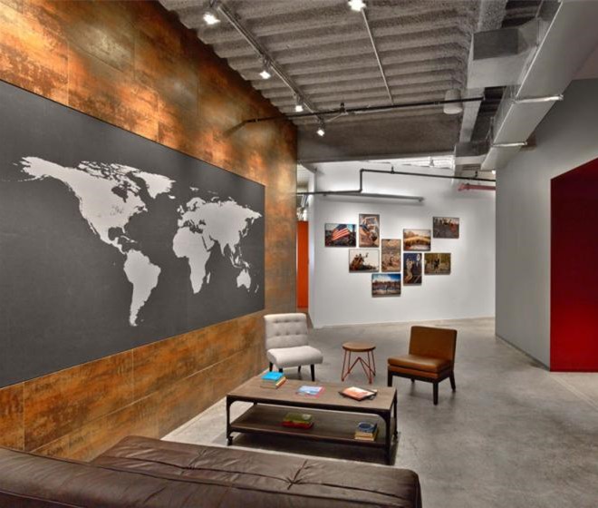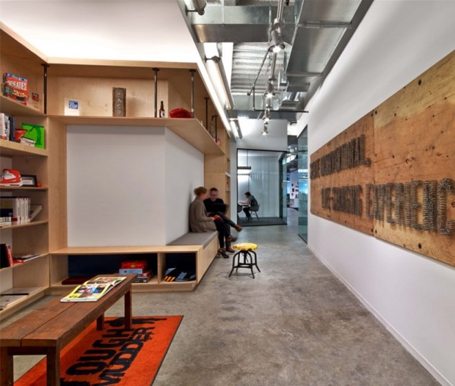 每個(gè)元素看起來(lái)都十分隨意,不過(guò)卻專(zhuān)業(yè)并且十分友好。從模仿考頓鋼的墻面到重新利用的木頭、印著Tough Mudder標(biāo)志和簽名的水泥煤渣磚會(huì)議桌。該設(shè)計(jì)提供了一個(gè)現(xiàn)代美感與工業(yè)化魅力結(jié)合的空間。