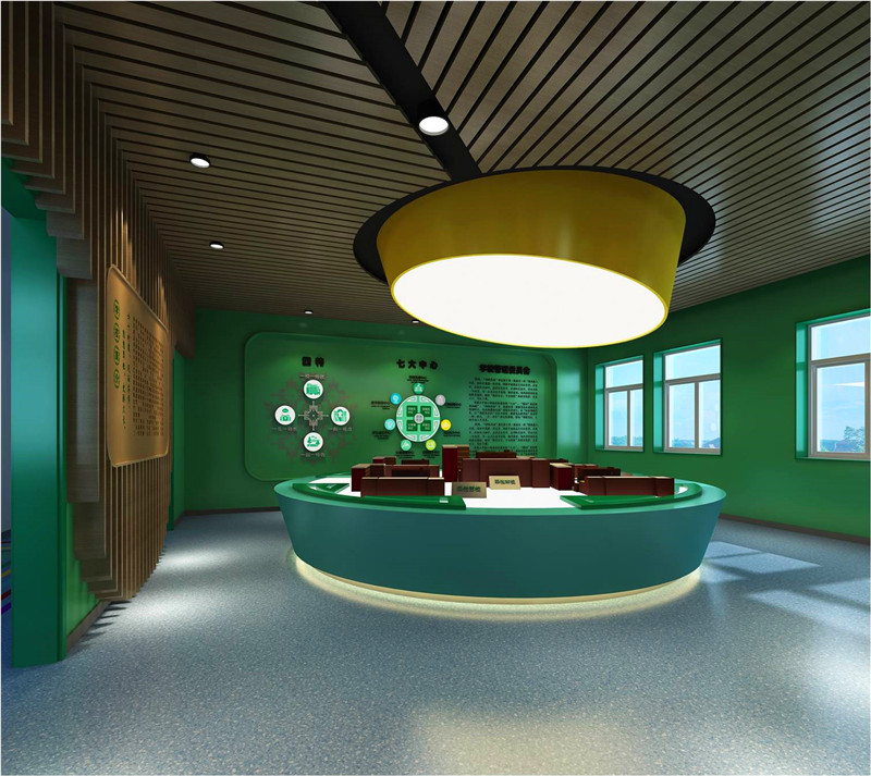 入口結(jié)合學(xué)校輔助圖形綠色墻面與翠微賦的結(jié)合及辦學(xué)特色的墻面設(shè)計(jì)直接將參觀者置于濃濃的文化氛圍中展示了教育的品牌特色。