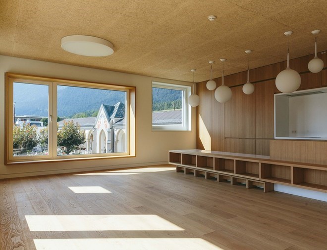 所有房間組成了一個(gè)和諧連續(xù)的空間,適宜兒童尺度的趣味景觀設(shè)計(jì)使孩子們可以欣賞室內(nèi)或室外多彩多樣的迷人風(fēng)景,橫向和縱向的開窗更豐富了這種體驗(yàn)。