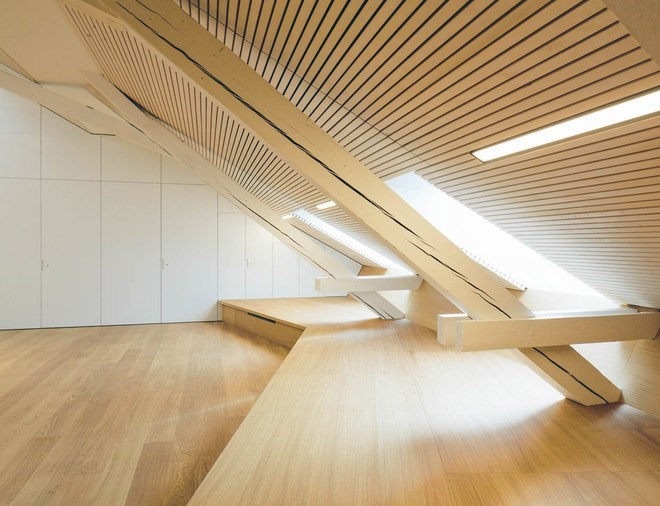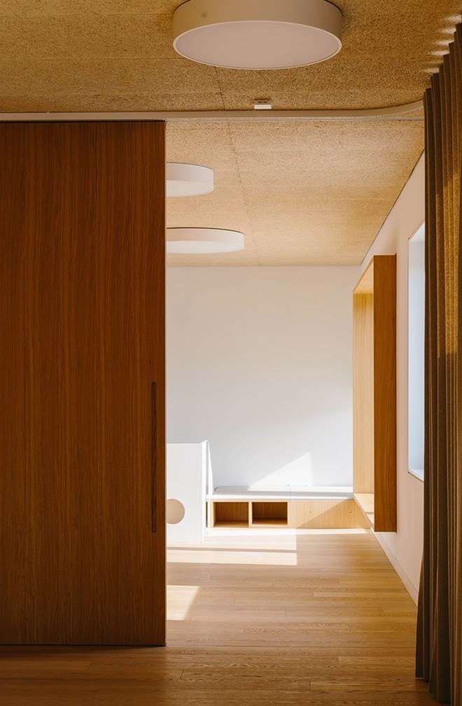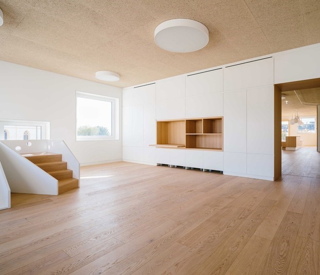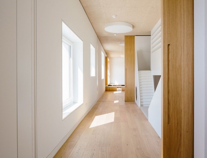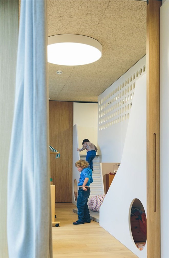 樓梯直接通往公共用餐區(qū),它與八組兒童房間相連組成了一個(gè)巨大的共享空間。孩子在這里學(xué)習(xí)娛樂,所有空間都均質(zhì)排布。建筑師設(shè)計(jì)了大量的被動(dòng)式節(jié)能屋。
