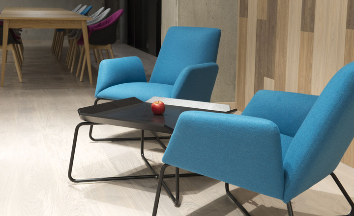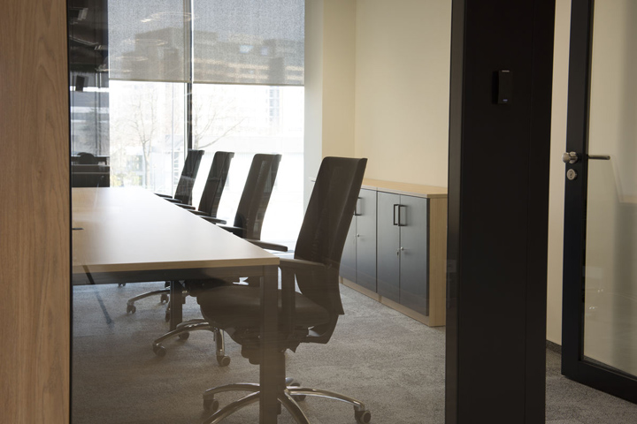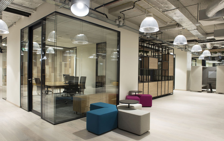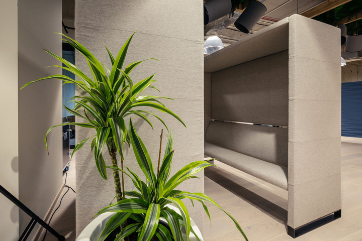 開放空間和輔助空間(文印室、茶水區(qū)、付費電話會議室、電話亭等)圍繞一處大型開放的廚房咖吧而設(shè)。黑色方管制作的展示架兼具實用和裝飾性,帶來強烈的工業(yè)美學(xué)特征。