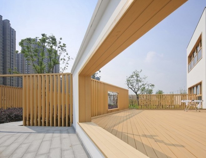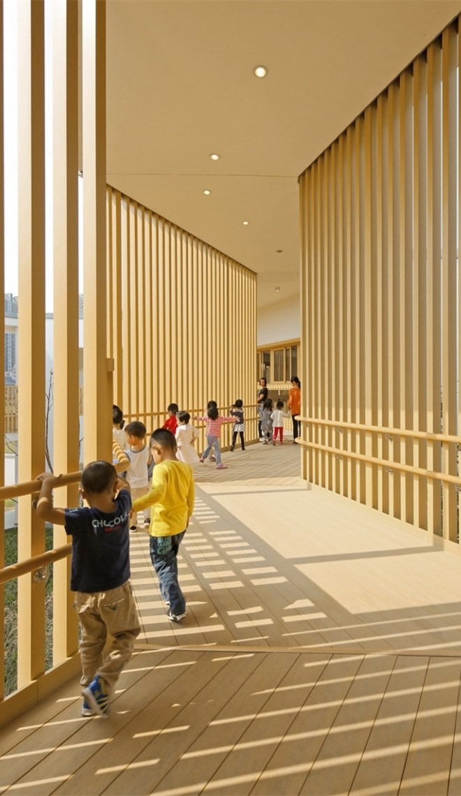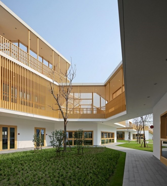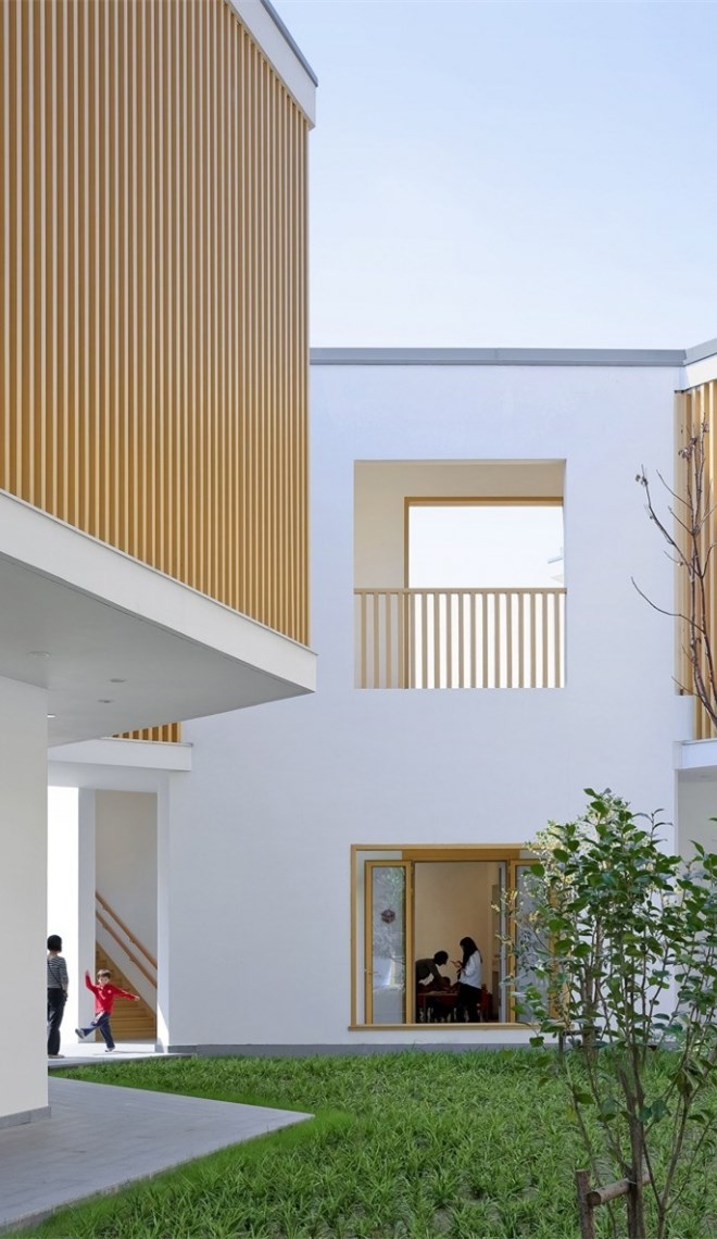 在這片7400平米的用地上,要容納15個(gè)班,6600平米三層以下的建筑以及各種室外活動(dòng)場(chǎng)地,是頗為緊張的。不過(guò),我們還是想通過(guò)這次機(jī)會(huì),為現(xiàn)代都市里的兒童設(shè)計(jì)一個(gè)有庭院的幼兒園,給他們留下關(guān)于庭院生活的情感和記憶,并通過(guò)庭院幫助他們認(rèn)識(shí)自然、認(rèn)識(shí)社會(huì)、塑造自己。