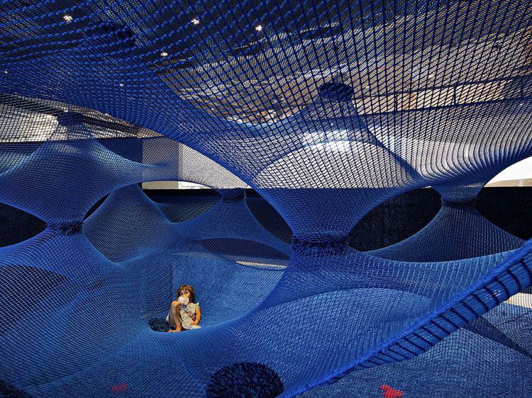 彩色攀爬網(wǎng)的偏心荷載和高懸掛點,需要設(shè)計一個堅固的支撐結(jié)構(gòu)。半透明的攀爬網(wǎng),看起來像在空中漂浮,他們的彈性為所有的孩子提供了一個安全的玩耍空間,這個攀爬網(wǎng)拉長和收縮自然,像一個生物體,經(jīng)常以一種意想不到的方式吸收以及釋放能量。