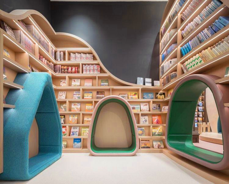 本案設(shè)計思路來源與卡通蘑菇屋,用蘑菇的外形輪廓制作書架以及閱讀區(qū)座位,給孩子們創(chuàng)造生動活剝活波的就讀空間,整個設(shè)計都沒有設(shè)置可移動的家具,在書架邊緣以及就坐區(qū)均采用軟包處理,以保證孩子在自由閱讀時的安全問題。
