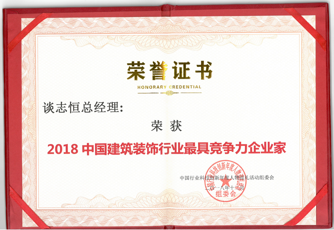 英特威迅總經(jīng)理談志恒先生榮獲:建筑裝飾行業(yè)最具競(jìng)爭(zhēng)力企業(yè)家。